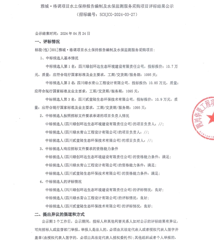 雅城·格調(diào)項(xiàng)目水土保持報(bào)告編制及水保監(jiān)測(cè)服務(wù)采購(gòu)項(xiàng)目評(píng)標(biāo)結(jié)果公示