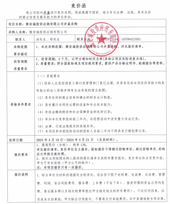 雅安城投供應(yīng)鏈有限公司井蓋采購競價(jià)公告