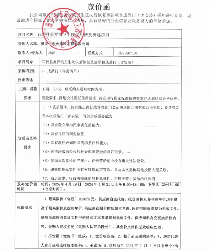 石棉縣美羅鎮(zhèn)衛(wèi)生院災(zāi)后恢復(fù)重建項(xiàng)目競(jìng)價(jià)公告