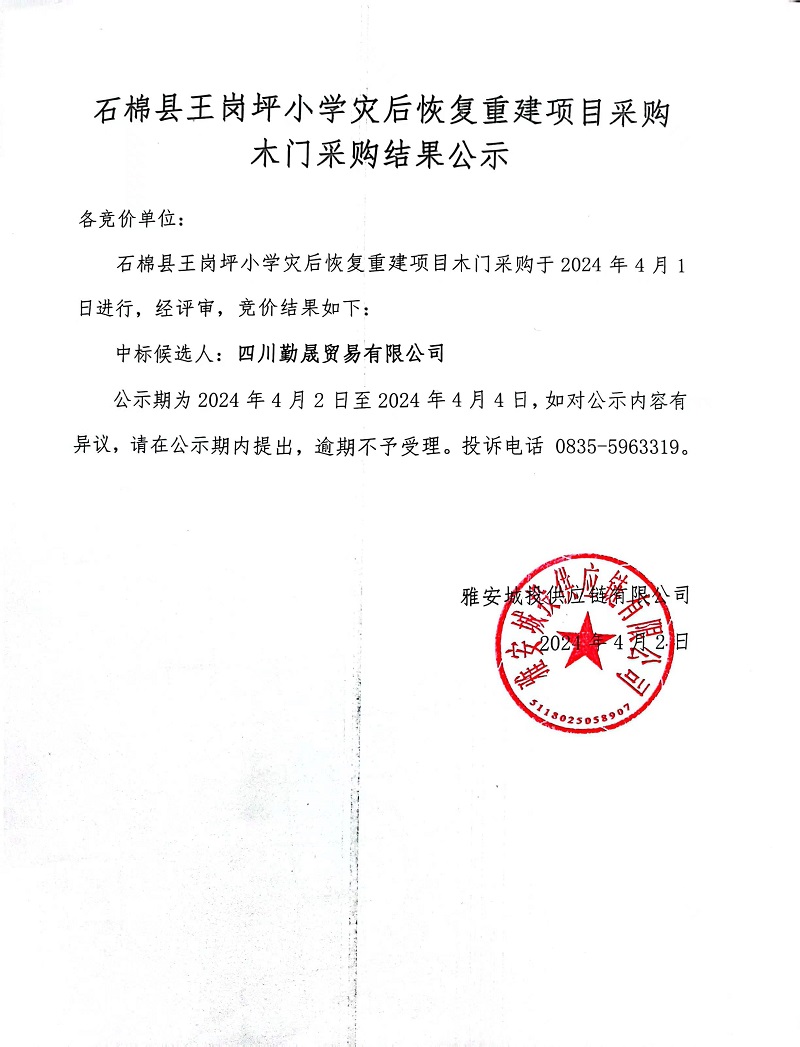 石棉縣王崗坪小學災后恢復重建項目采購木門采購結果公示
