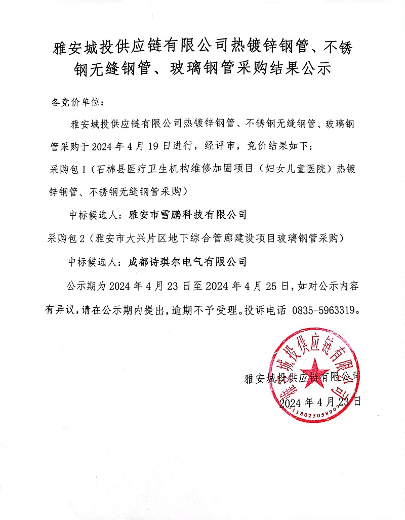 雅安城投供應鏈有限公司熱鍍鋅鋼管、不銹鋼無縫鋼管、玻璃鋼管采購結果公示