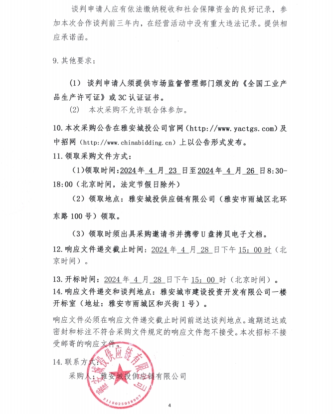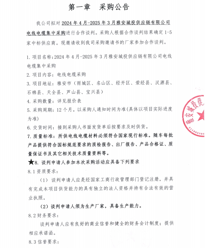 2024年4月-2025年3月雅安城投供應(yīng)鏈有限公司電線電纜集中采購(gòu)公告