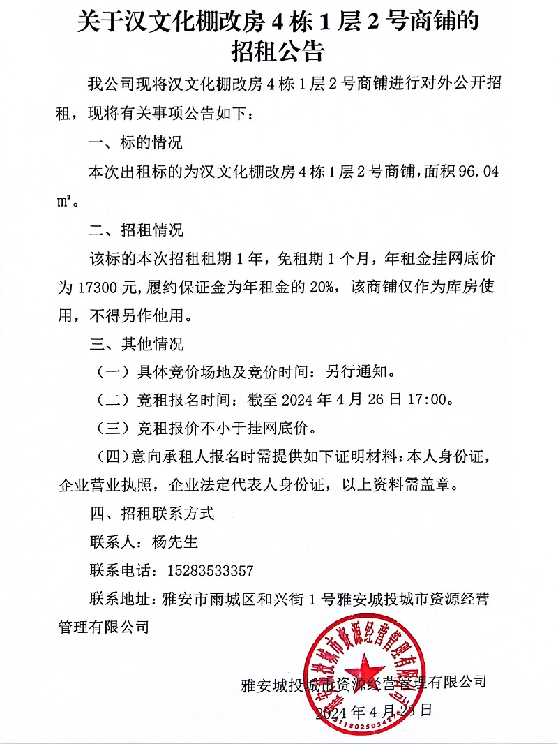 關(guān)于漢文化棚改房4棟1層2號(hào)商鋪的招租公告