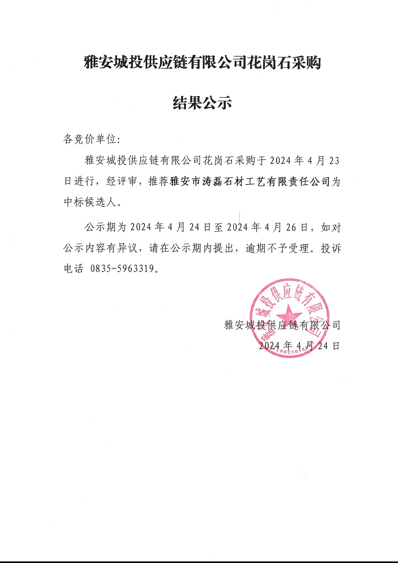 雅安城投供應鏈有限公司花崗石采購結果公示