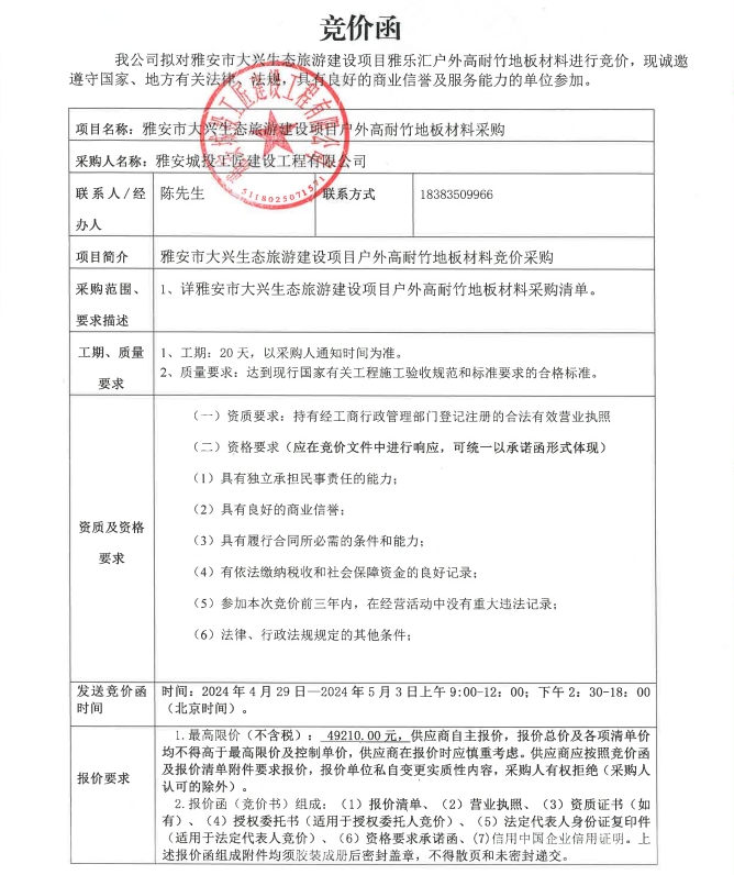雅安市大興生態(tài)旅游建設(shè)項(xiàng)目霽雨橋、木棧道戶外高耐竹地板材料采購競(jìng)價(jià)公告