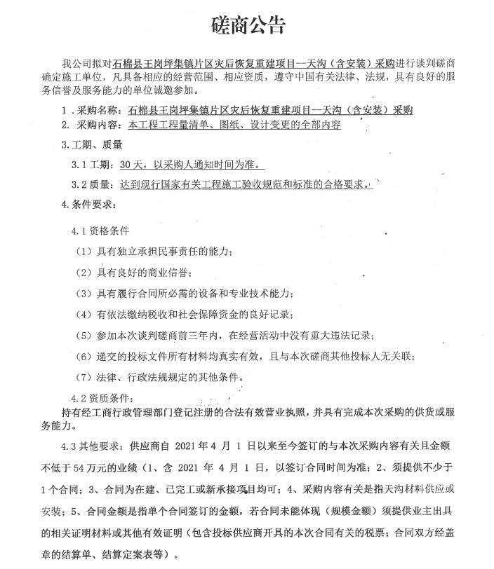 石棉縣王崗坪集鎮(zhèn)片區(qū)災(zāi)后恢復(fù)重建項(xiàng)目--天溝(含安裝)采購(gòu)談判磋商公告