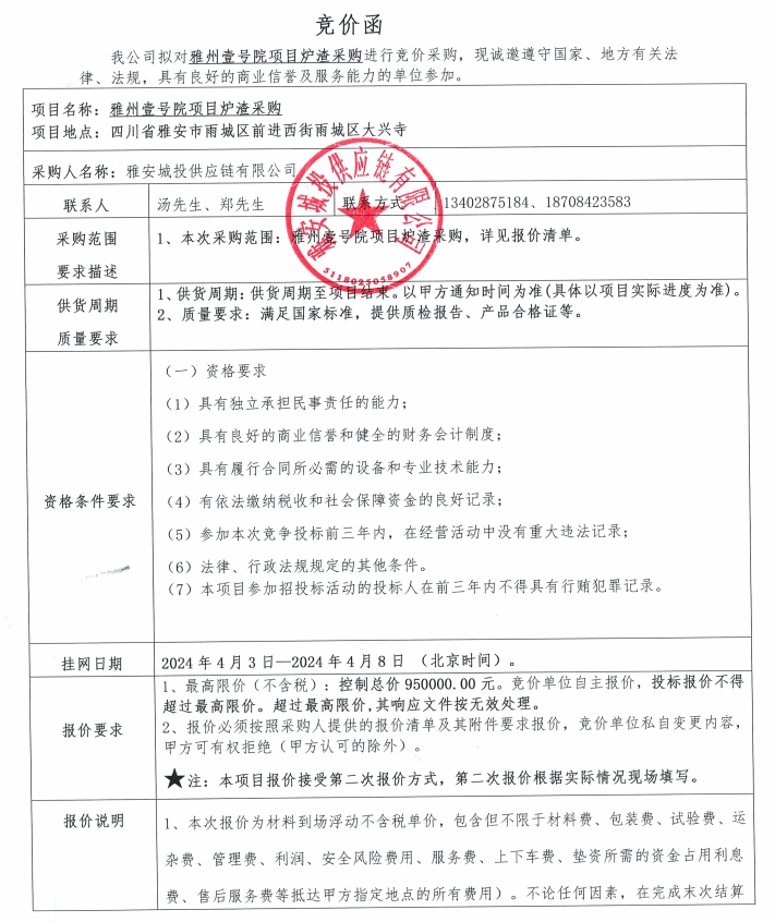 雅州壹號院項(xiàng)目爐渣采購競價(jià)公告