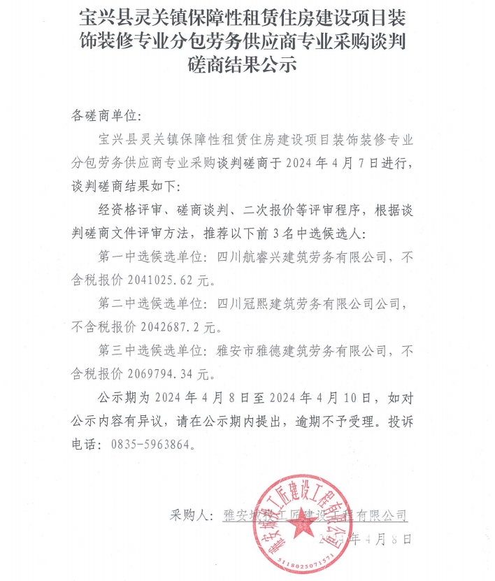 寶興縣靈關鎮(zhèn)保障性租賃住房建設項目裝飾裝修專業(yè)分包勞務供應商專業(yè)采購談判磋商結(jié)果公示