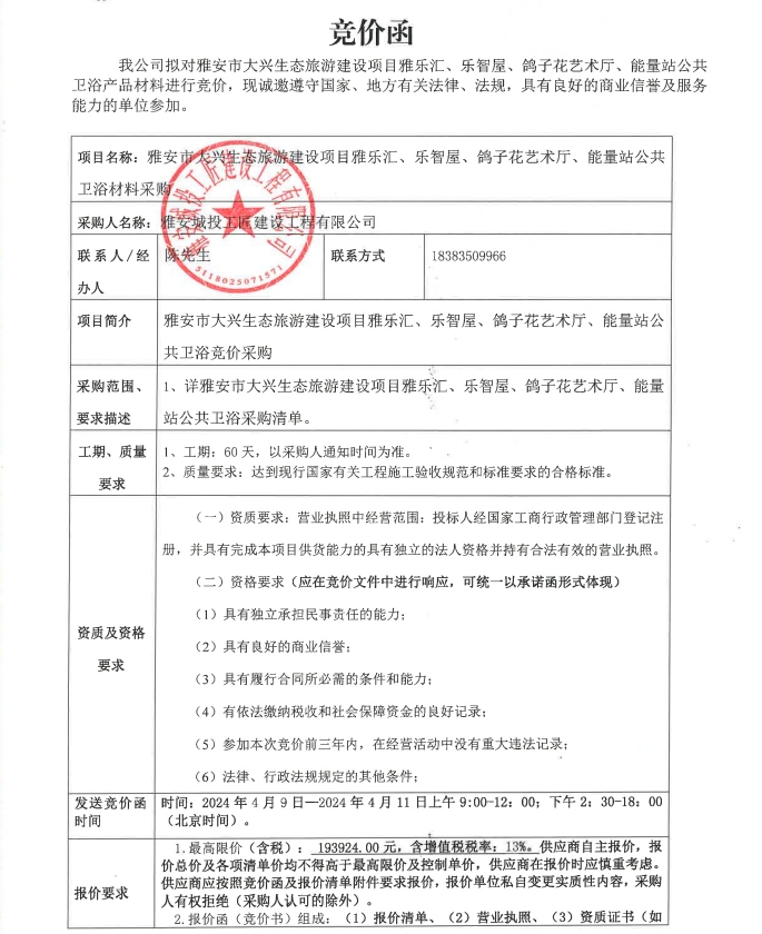雅安市大興生態(tài)旅游建設(shè)項目雅樂匯、樂智屋、鴿子花藝術(shù)廳、能量站公共衛(wèi)浴材料采購競價公告