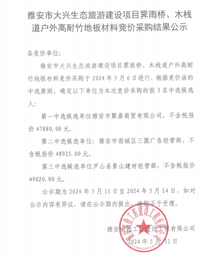 雅安市大興生態(tài)旅游建設(shè)項目霽雨橋、木棧道戶外高耐竹地板材料競價采購結(jié)果公示