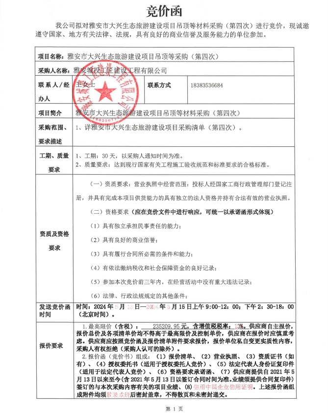 雅安市大興生態(tài)旅游建設(shè)項(xiàng)目吊頂?shù)炔少彛ǖ谒拇危└們r(jià)公告