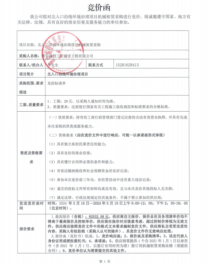 北入口沿線環(huán)境治理項(xiàng)目機(jī)械租賃采購競價(jià)公告