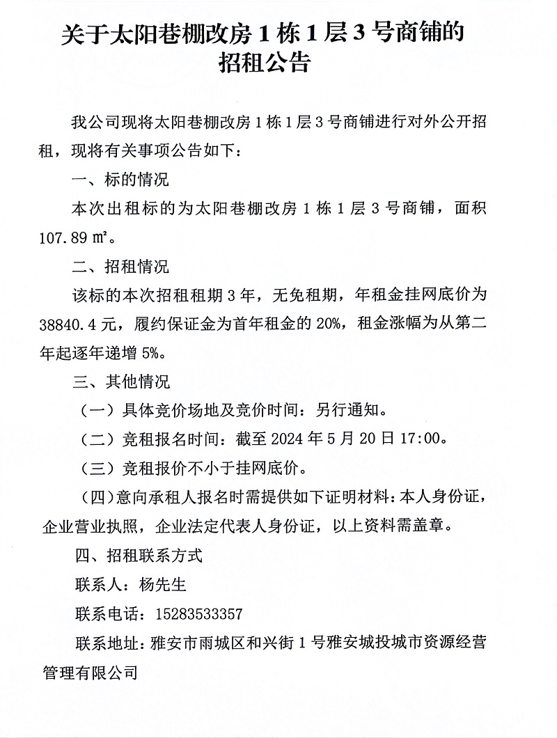 關(guān)于太陽巷棚改房1棟1層3號(hào)商鋪的招租公告