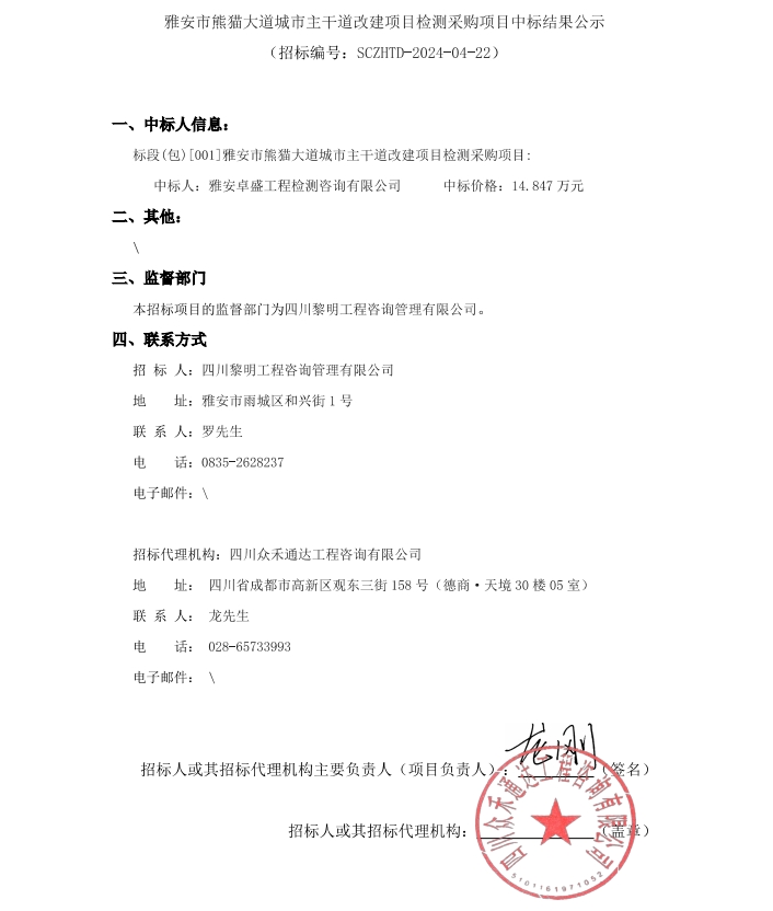 雅安市熊貓大道城市主干道改建項(xiàng)目檢測采購項(xiàng)目中標(biāo)結(jié)果公示