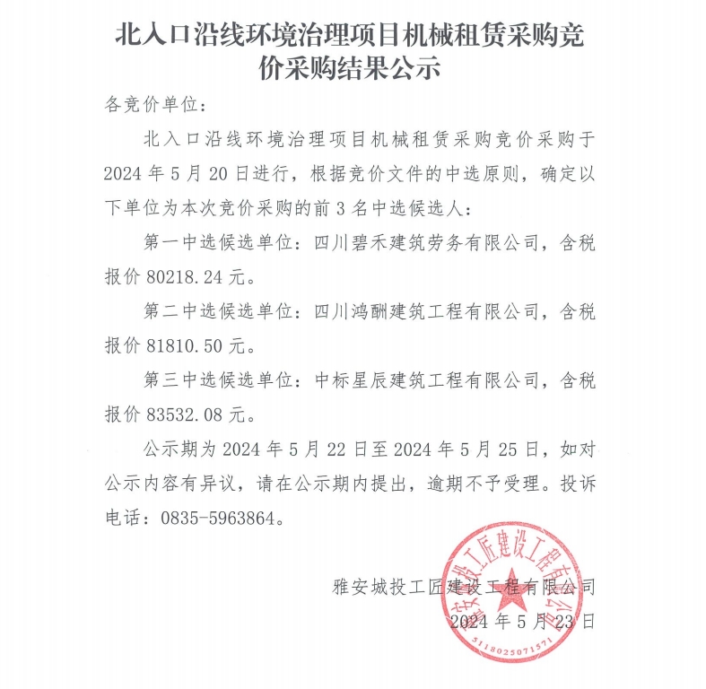 北入口沿線環(huán)境治理項目機械租賃采購競價采購結(jié)果公示