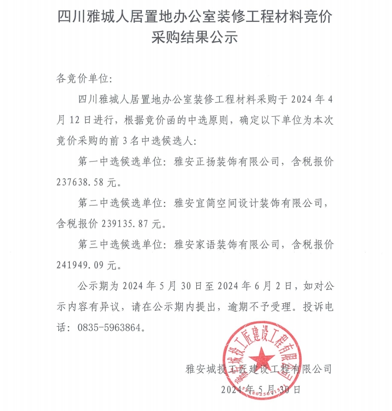 四川雅城人居置地辦公室裝修工程材料競(jìng)價(jià)采購(gòu)結(jié)果公示
