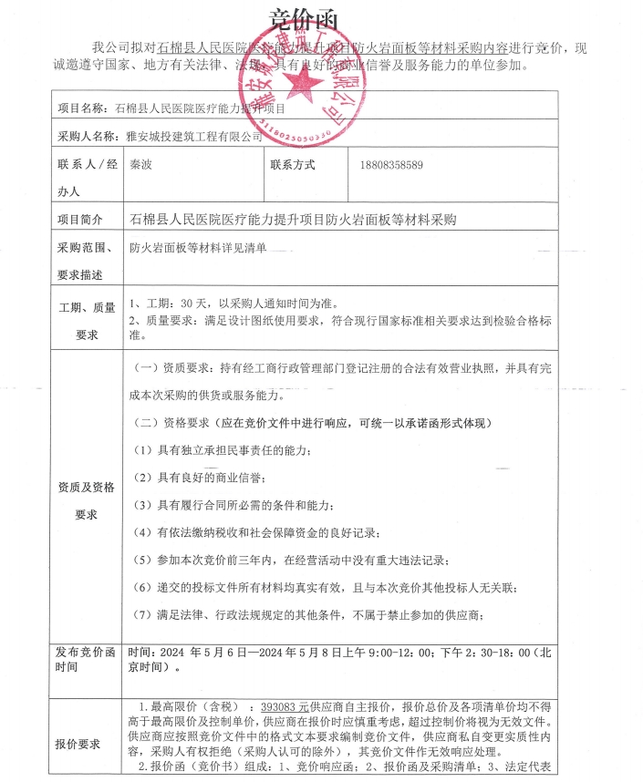 石棉縣人民醫(yī)院醫(yī)療能力提升項目防火巖面板等材料采購內(nèi)容競價公告