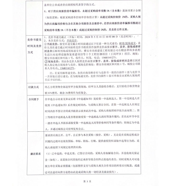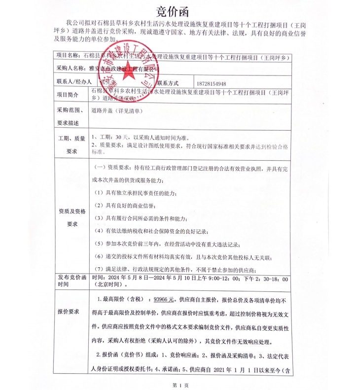 石棉縣草科鄉(xiāng)農(nóng)村生活污水處理設(shè)施恢復重建項目等十個工程打捆項目(王崗坪鄉(xiāng))道路井蓋競價公告