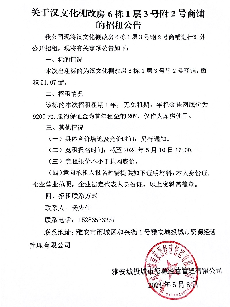 關(guān)于漢文化棚改房6棟1層3號(hào)附2號(hào)商鋪的招租公告