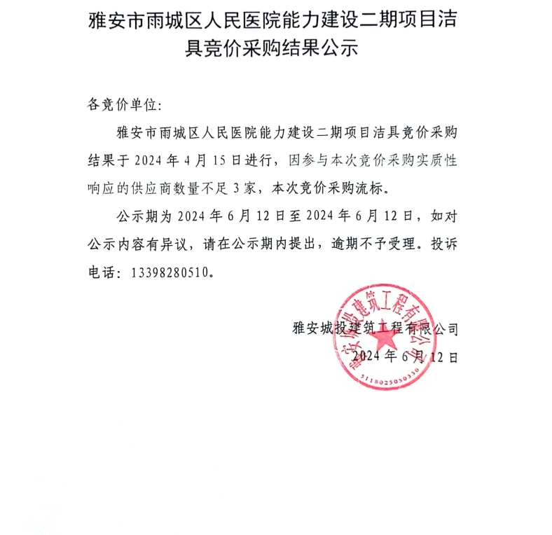 雅安市雨城人民醫(yī)院能力建設(shè)二期項(xiàng)目潔具競(jìng)價(jià)采購結(jié)果公示