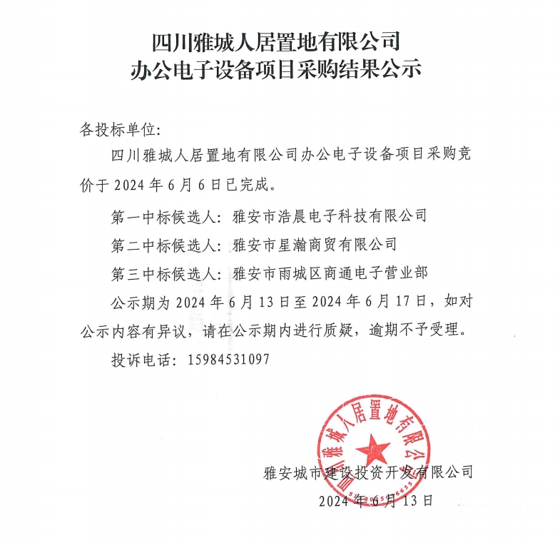 四川雅城人居置地有限公司辦公電子設(shè)備項(xiàng)目采購結(jié)果公示