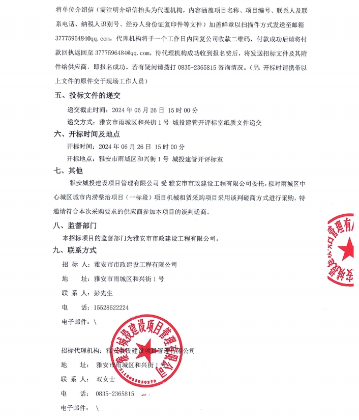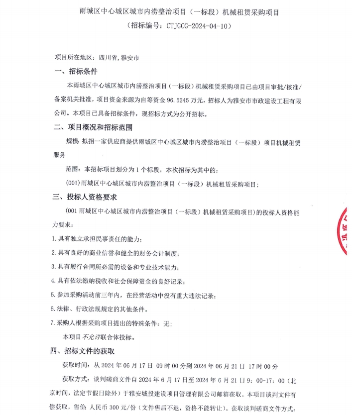 雨城區(qū)中心城區(qū)城市內(nèi)澇整治項目(一標段)項目機械租賃采購項目招標公告