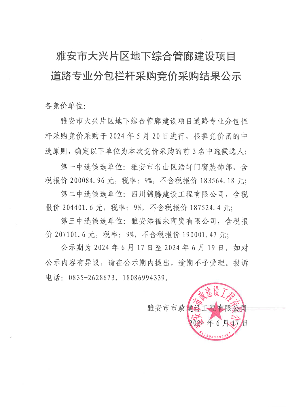 雅安市大興片區(qū)地下綜合管廊建設(shè)項(xiàng)目道路專業(yè)分包欄桿采購競價采購結(jié)果公示