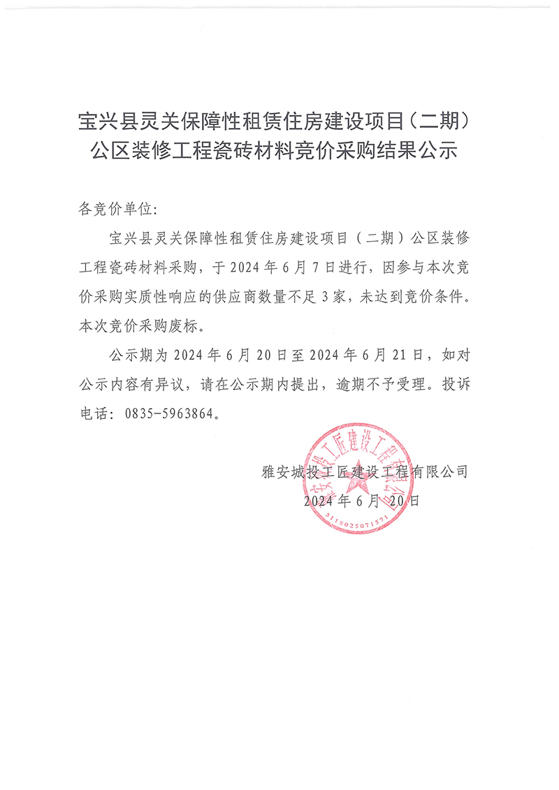 寶興縣靈關(guān)保障性租賃住房建設(shè)項(xiàng)目(二期)公區(qū)裝修工程瓷磚材料競(jìng)價(jià)采購結(jié)果公示