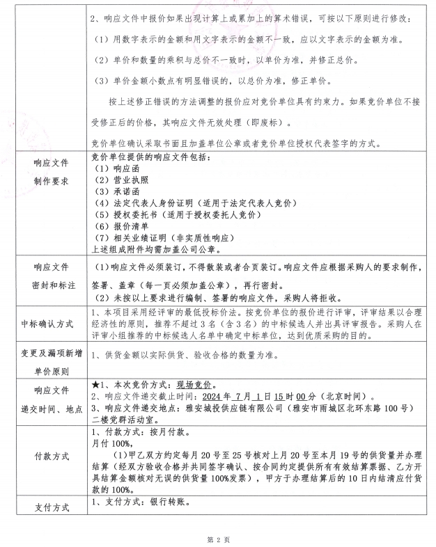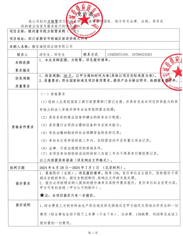 雅州壹號院方矩管采購(二次)競價公告