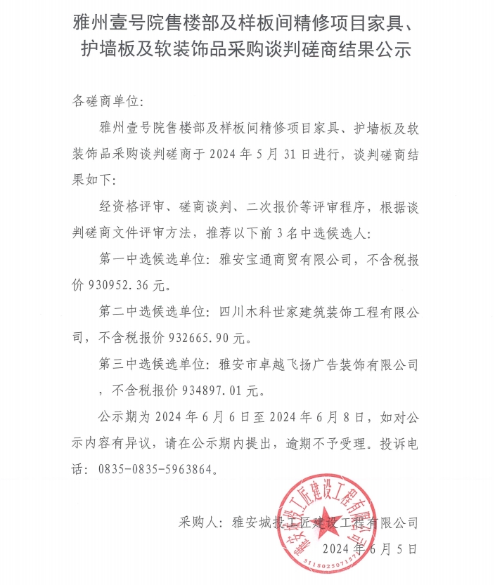 雅州壹號(hào)院售樓部及樣板間精修項(xiàng)目家具、護(hù)墻板及軟裝飾品采購(gòu)談判磋商結(jié)果公示