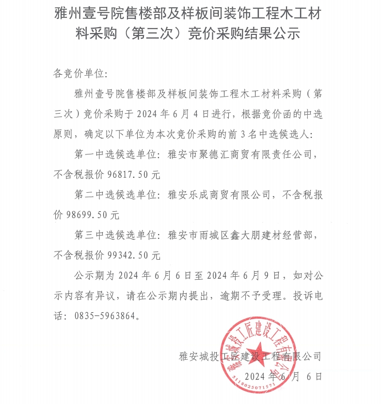 雅州壹號院售樓部及樣板間裝飾工程木工材料采購(第三次)競價采購結果公示