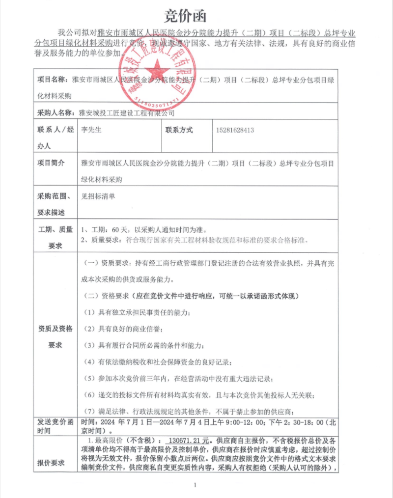 雅安市雨城區(qū)人民醫(yī)院金沙分院能力提升(二期)項(xiàng)目(二標(biāo)段)總坪專業(yè)分包項(xiàng)目綠化材料采購競價公告