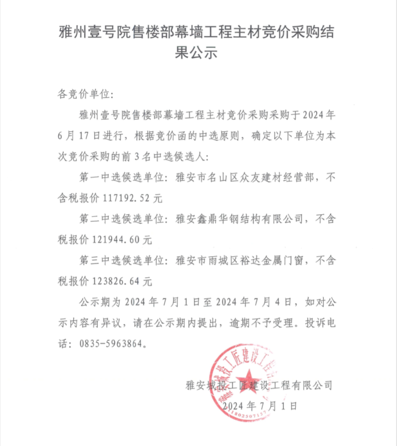 雅州壹號院售樓部幕墻工程主材競價采購結(jié)果公示