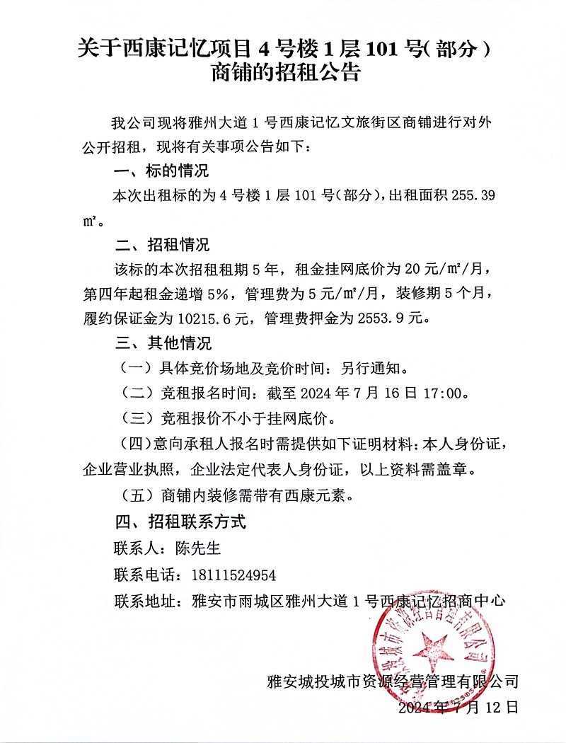 關(guān)于西康記憶項(xiàng)目4號(hào)樓1層101號(hào)(部分)商鋪的招租公告