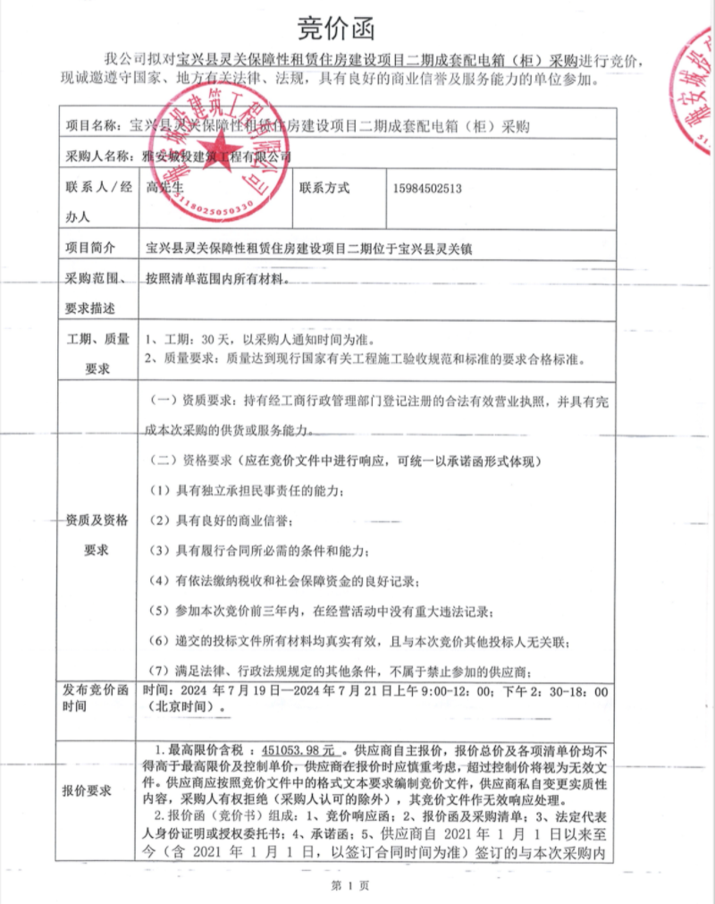 寶興縣靈關保障性租賃住房建設項目二期成套配電箱(柜)采購競價公告