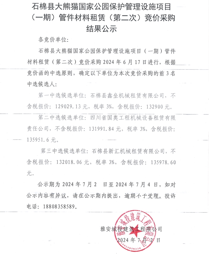 石棉縣大熊貓國家公園保護(hù)管理設(shè)施項(xiàng)目(一期)管件材料租賃(第二次)競價采購結(jié)果公示
