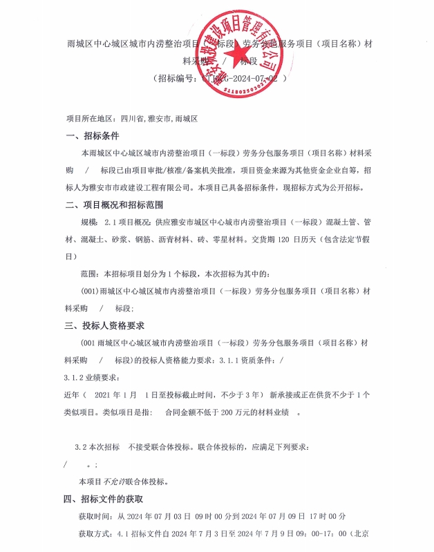 雅安市城區(qū)中心城市內(nèi)澇整治項(xiàng)目(一標(biāo)段)勞務(wù)分包服務(wù)項(xiàng)目(項(xiàng)目名稱)材料采購招標(biāo)公告