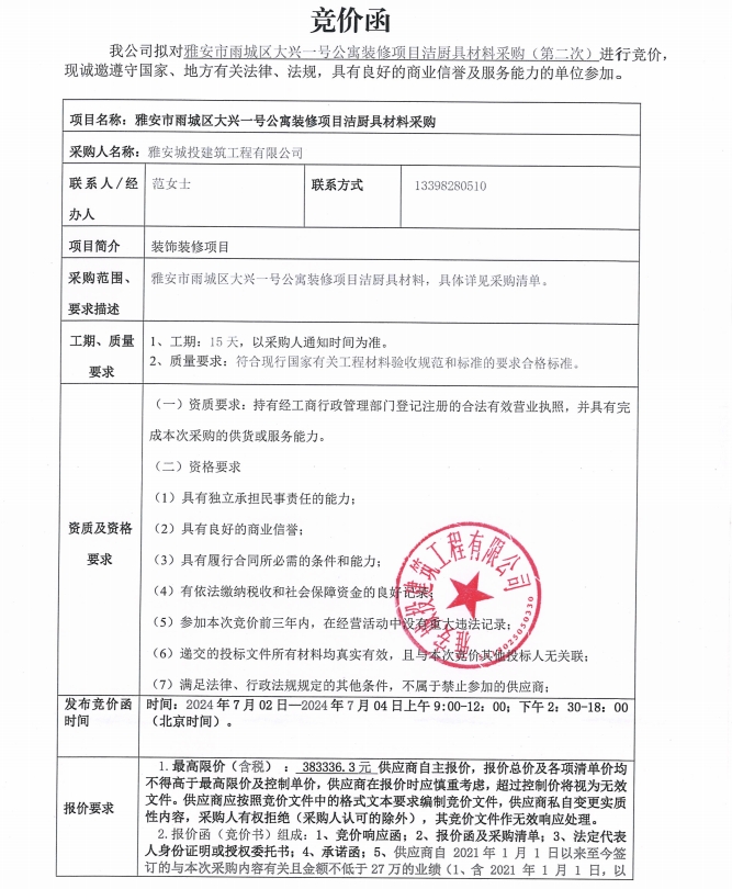 雅安市雨城區(qū)大興一號公寓裝修項目潔廚具材料采購(第二次)競價公告