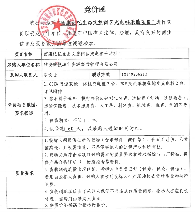 雅安城投城市資源經營管理有限公司西康記憶生態(tài)文旅街區(qū)充電樁采購項目競價公告