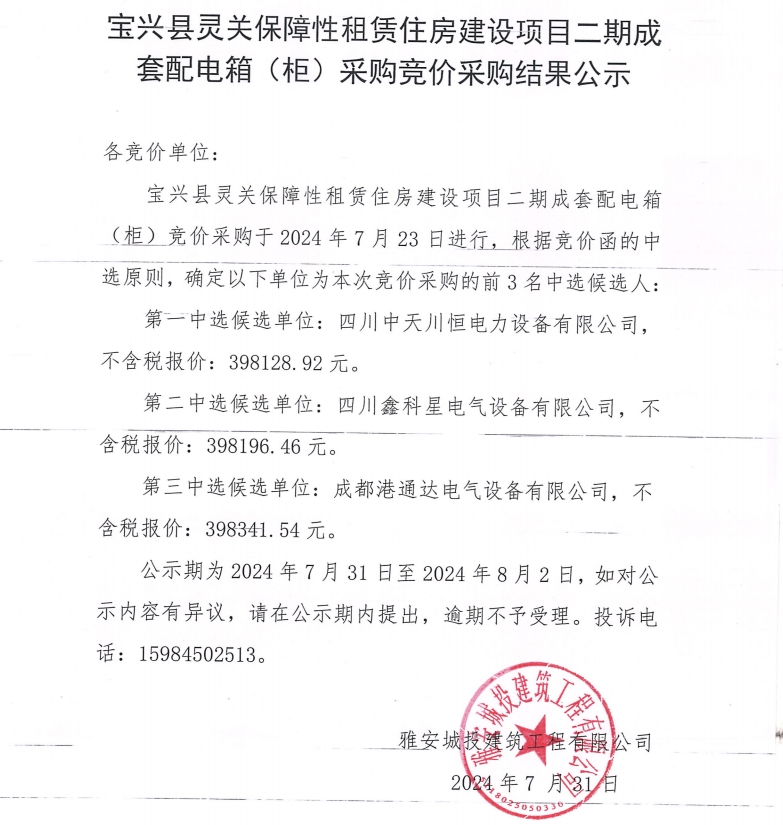 寶興縣靈關保障性租賃住房建設項目二期成套配電箱(柜)采購競價采購結果過公示