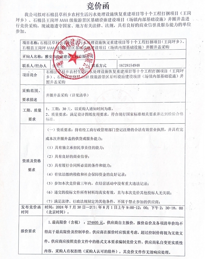 石棉縣草科鄉(xiāng)農(nóng)村生活污水處理設(shè)施恢復(fù)重建項(xiàng)目等十個(gè)工程打捆項(xiàng)目(王崗坪鄉(xiāng))、石棉縣王崗坪AAAA級(jí)旅游景區(qū)基礎(chǔ)設(shè)施建設(shè)項(xiàng)目(場(chǎng)鎮(zhèn)內(nèi)部基礎(chǔ)設(shè)施)井圈井蓋采購競(jìng)價(jià)公告