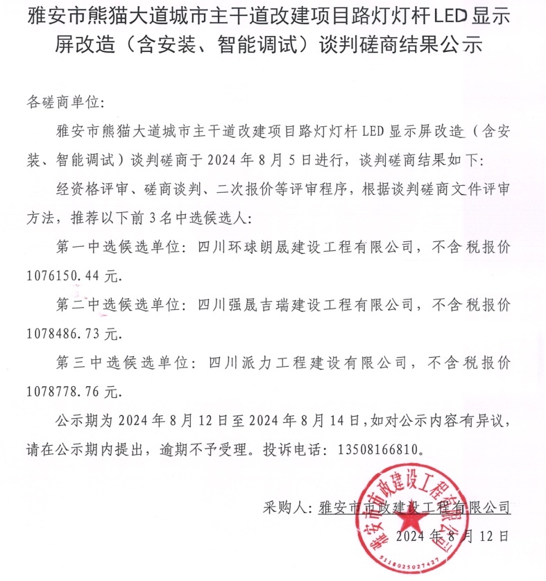 雅安市熊貓大道城市主干道改建項目路燈燈桿LED顯示屏(含安裝、智能化調試)談判磋商結果公示