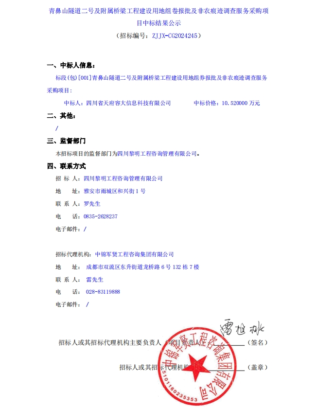 青鼻山隧道二號及附屬橋梁工程建設用地組卷報批及非農(nóng)痕跡調(diào)查服務采購項目中標結(jié)果公示