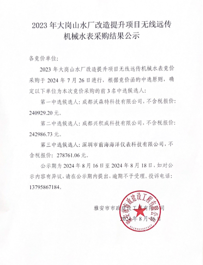 2023年大崗山水廠改造提升項(xiàng)目無(wú)線遠(yuǎn)傳機(jī)械水表采購(gòu)結(jié)果公示