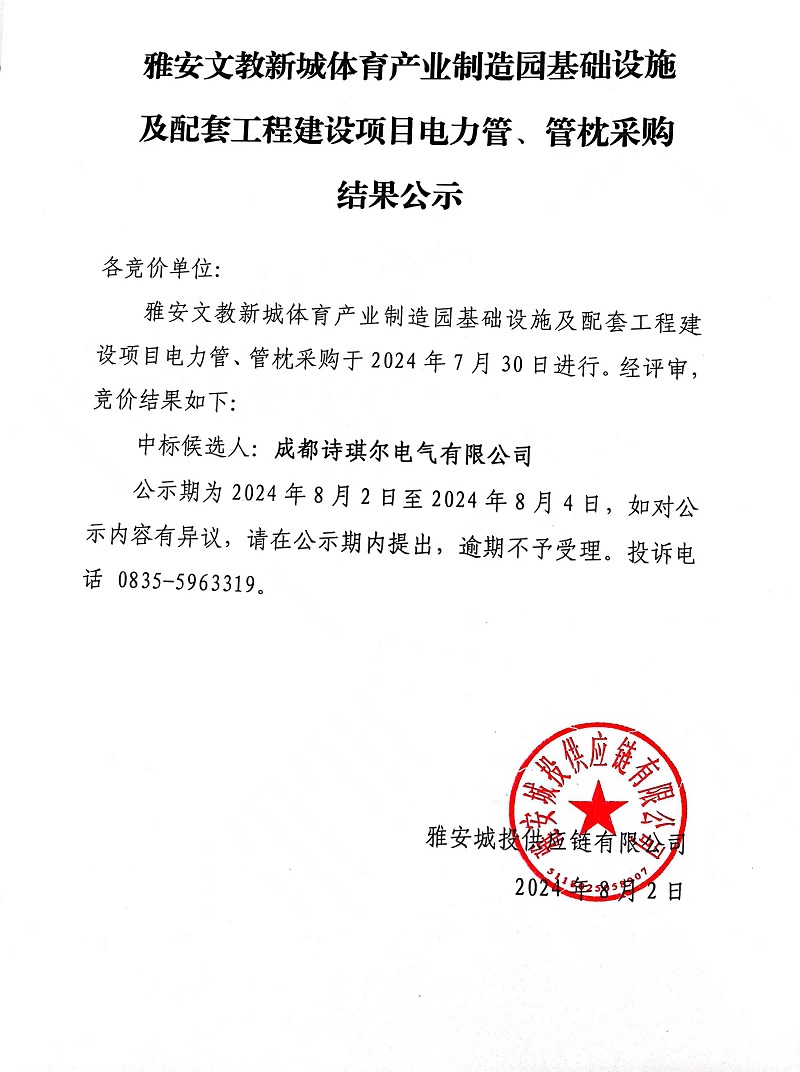 雅安文教新城體育產(chǎn)業(yè)制造園基礎設施及配套工程建設項目電力管、管枕采購結(jié)果公示
