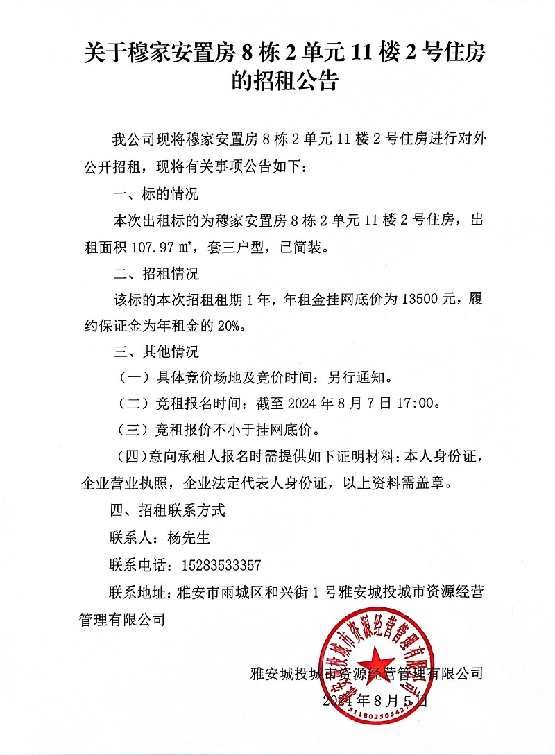 關(guān)于穆家安置房8棟2單元11樓2號(hào)住房的招租公告