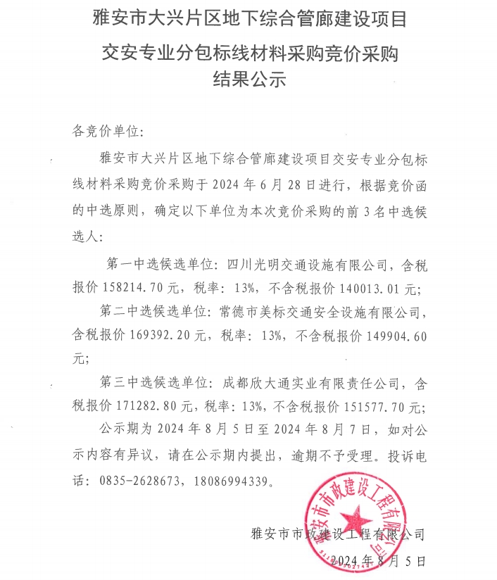 雅安市大興片區(qū)地下綜合管廊建設(shè)項目道路專業(yè)分包標線材料采購競價采購結(jié)果公示