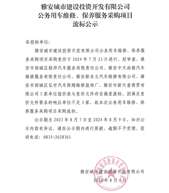 雅安城市建設(shè)投資開發(fā)有限公司公務用車維修、保養(yǎng)服務采購項目流標公示