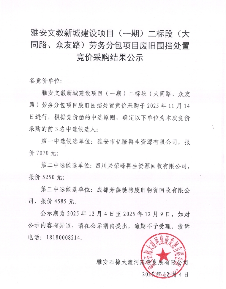 雅安文教新城建設(shè)項目(一期)二標段(大同路、眾友路)勞務分包項目廢舊圍擋處置競價采購結(jié)果公示