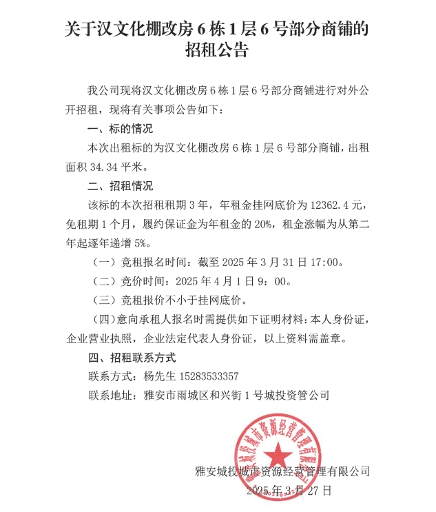 關(guān)于漢文化棚改房6棟1層6號部分商鋪的招租公告